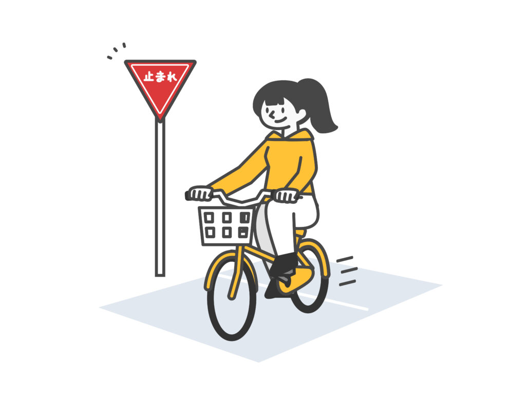 - 「止まれ」の標識では、サドルからお尻を浮かせて、しっかりと足を地面につける。